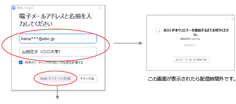 メールアドレスと氏名(所属)を入力し、【Webセミナーに参加】ボタンをクリックして入室してください。